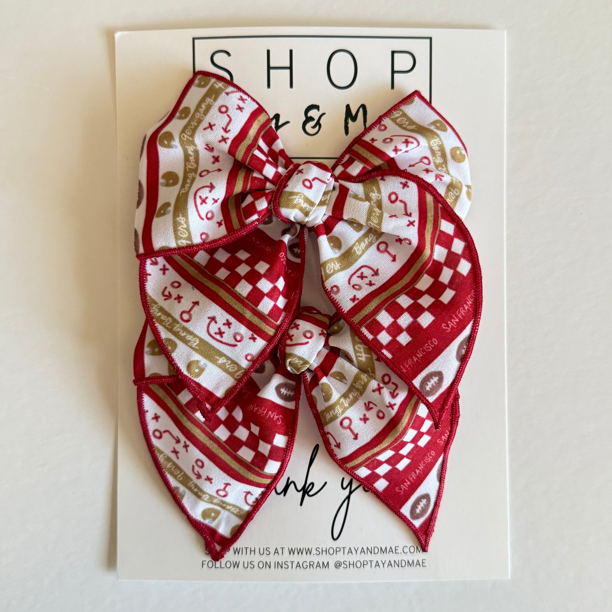 Bows are not a toy. Please do not let your child play with the hair bows as they can become wrinkled, dirty, or pulled apart. All bows are glued before they leave Shop Tay & Mae, but the will of a determined toddler can pull them apart. The clip is glued in for compliancy, but if the bow is ripped apart the clip is a choking hazard. We advise that you take bows off when children are unsupervised for choking hazards and suffocation risks.
